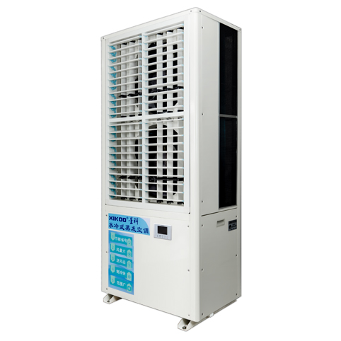 首先由外機采用濕簾蒸發(fā)式冷凝的技術(shù)來給循環(huán)水降溫,水溫降至常溫后流經(jīng)內(nèi)機的熱交換系統(tǒng)(此時壓縮機已運作,已將冷媒壓縮成高溫高壓狀態(tài))從而帶走大部分高溫冷媒的熱量而形成常溫冷媒,常溫冷媒再經(jīng)過節(jié)流閥后變成低溫低壓的冷媒,輸送至內(nèi)機上半部分的蒸發(fā)器而吹出冷風(fēng);